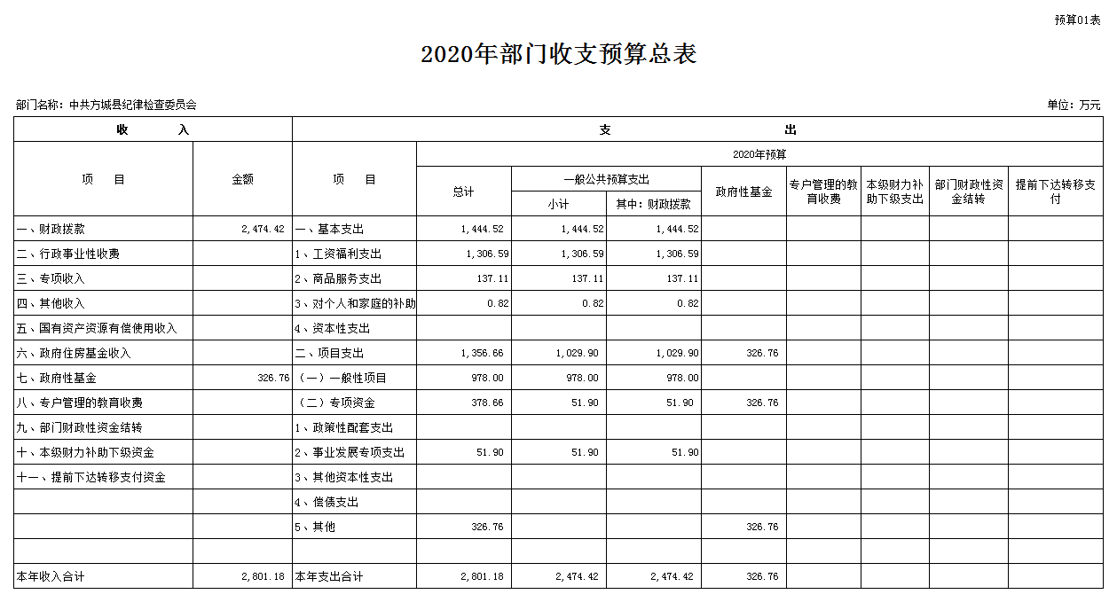 附:中共方城县纪律检查委员会2020年度部门预算表