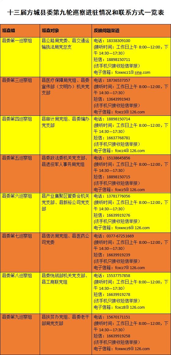 本轮巡察6月5日结束。巡察期间,县委各巡察组均开通专门值班电话、接收短信手机、电子信箱、邮政邮箱等联系方式,主要受理反映被巡察单位领导班子及其成员、部门二级单位主要负责人和重要岗位领导干部的来信来电来访,重点受理关于党员领导干部个人违反政治纪律、组织纪律、廉洁纪律、群众纪律、工作纪律和生活纪律等方面的举报和反映,其他不属于巡察受理范围的信访问题,将按规定移交有关部门处理。按省、市、县委疫情防控有关规定和要求,疫情期间各巡察组暂不受理群众走访。