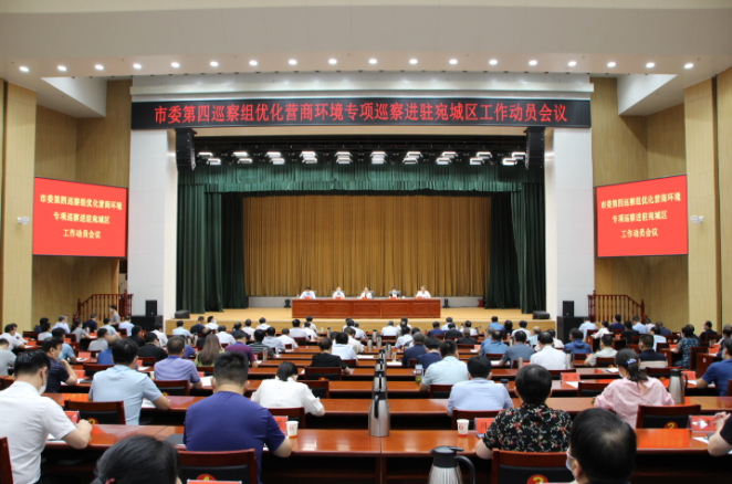 7月20日上午,市委第四巡察组优化营商环境专项巡察进驻宛城区工作动员会召开。市委第四巡察组组长于滔作动员讲话,宛城区委副书记陈明远主持会议,区委常委、副区长贾迪作表态发言。