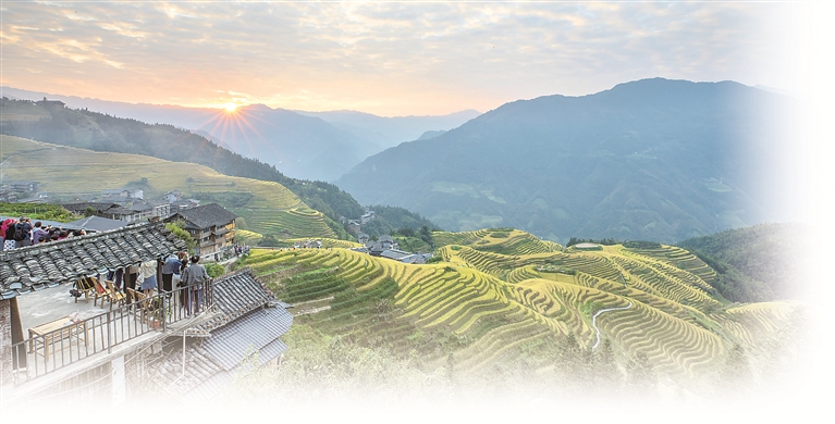 广西桂林龙脊梯田闻名于世。每到金秋时节,龙脊梯田稻浪翻滚,金色遍野,成为独特的风景线,吸引了世界各地的游客。图为游客在龙脊梯田观看日出。图片来源:视觉中国