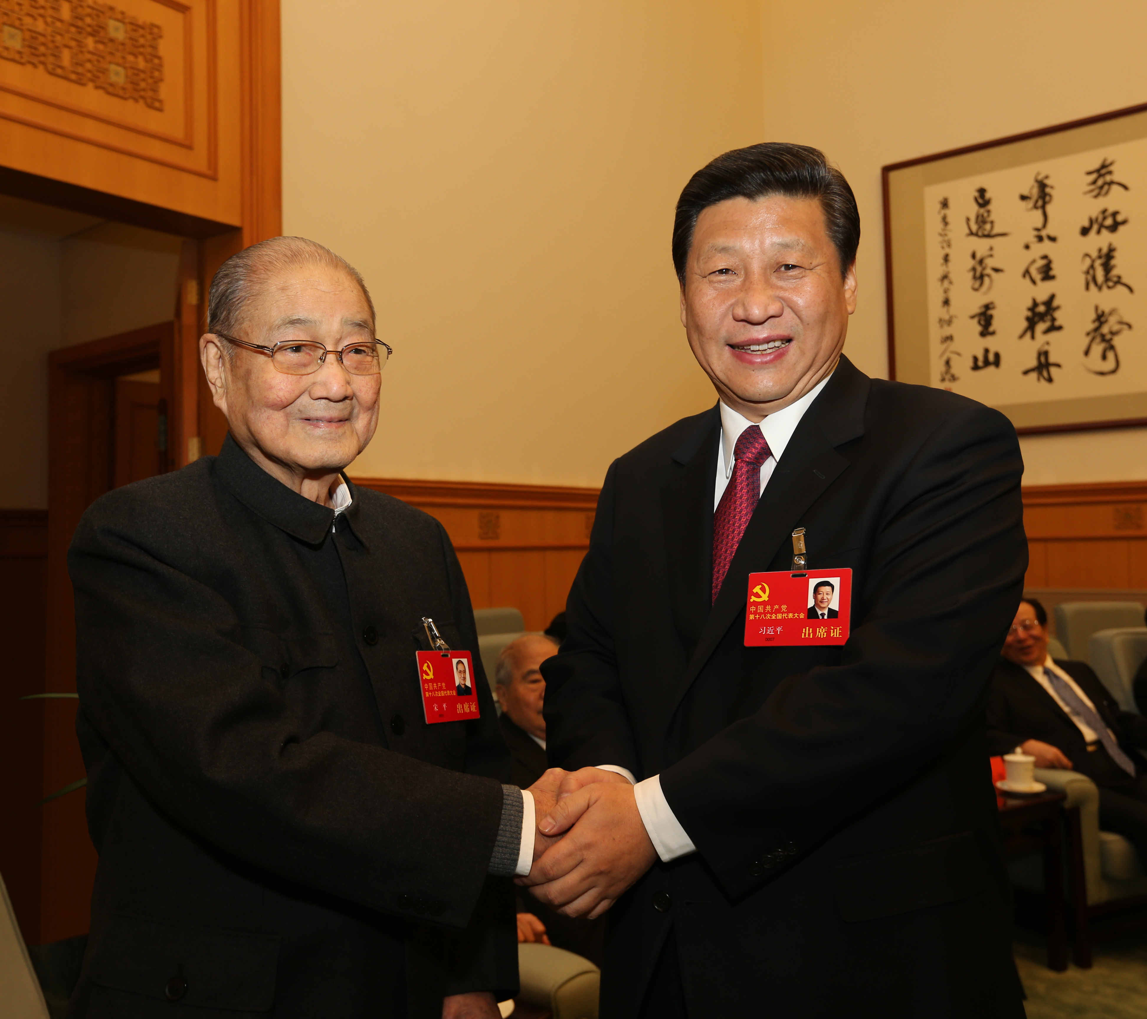 2012年11月14日,在党的十八大闭幕前,习近平同志同宋平同志在一起。新华社发