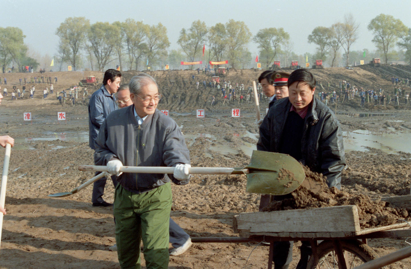 1991年11月13日,宋平同志(左)来到北京市通县(今通州区)张家湾凉水河整治工程工地参加劳动。新华社记者 刘建国 摄