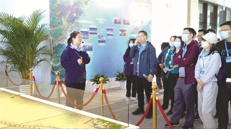 图为讲解员聂娅在蓝海豚岛的展厅里为登岛游客讲述港珠澳大桥的建设故事。港珠澳大桥管理局供图