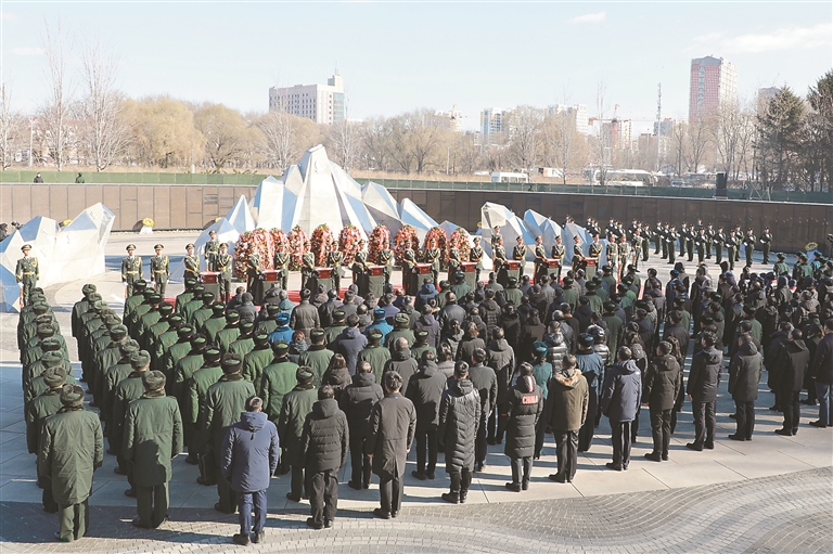 11月24日上午,第十批在韩中国人民志愿军烈士遗骸安葬仪式在沈阳抗美援朝烈士陵园举行。图为当日,参与第十批在韩中国人民志愿军烈士遗骸安葬仪式的人员集体默哀致敬。本报记者 李灵娜 摄