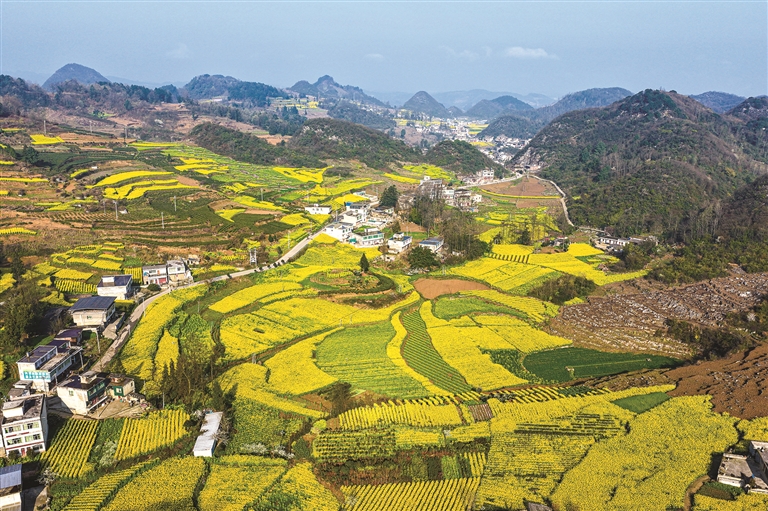 近年来,贵州省黔西市坚持党建引领,推行“党支部+合作社+农户”模式,以花为媒激活文旅融合,助力乡村振兴。图为该市雨朵镇龙场村油菜花竞相开放,金黄色的花海与村落、青山交相辉映,春意盎然。图片来源:视觉中国