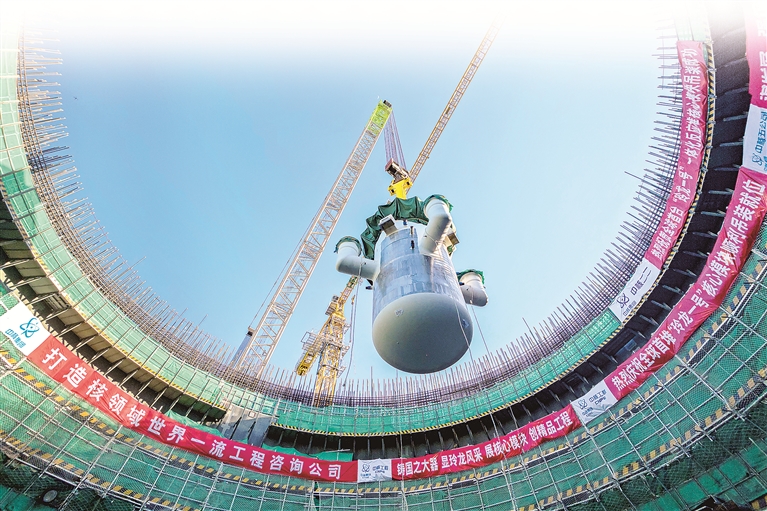 8月10日,海南昌江,在碧海蓝天的辉映下,全球首个陆上商用模块式小型核反应堆“玲龙一号”核心模块被高高吊起,向着核岛方向移动。历时5时48分,这颗“玲龙之心”被稳稳地安放在核岛中央。
