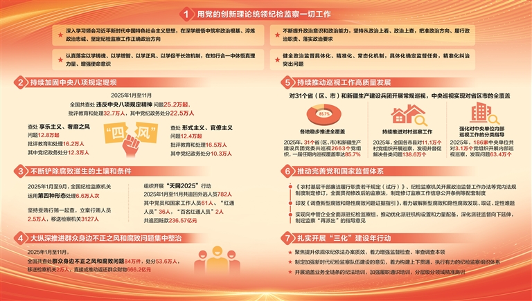 2025年,在以习近平同志为核心的党中央坚强领导下,中央纪委国家监委和各级纪检监察机关深入学习贯彻习近平新时代中国特色社会主义思想特别是习近平总书记关于党的建设的重要思想、关于党的自我革命的重要思想,持续推进党风廉政建设和反腐败斗争,聚焦“两个维护”强化政治监督,扎实开展深入贯彻中央八项规定精神学习教育,保持反腐败高压态势,深入推进风腐同查同治,坚决整治群众身边不正之风和腐败问题,完成对省区市巡视全覆盖,推动完善党和国家监督体系,深入开展“纪检监察工作规范化法治化正规化建设年”行动,推动纪检监察工作高质量发展取得新进展新成效。今日,本网推出特别报道,扼要展现31个省(区、市)和新疆生产建设兵团纪委监委一年来推动纪检监察工作高质量发展的具体实践。