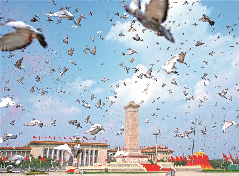 9月3日,纪念中国人民抗日战争暨世界反法西斯战争胜利80周年大会在北京隆重举行。图为纪念大会现场放飞鸽子。 新华社记者 牟宇 摄