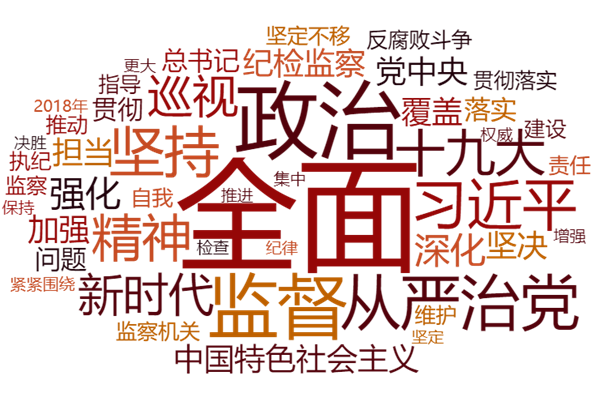 公报全文2831字,其中被提及数前十的关键词分别是“全面(25次)”“政治(17)”“监督(13次)”“坚持(13次)”“从严治党(12次)”“精神(12次)”“习近平(11次)”“十九大(10次)”“新时代(9次)”“巡视(9次)”。