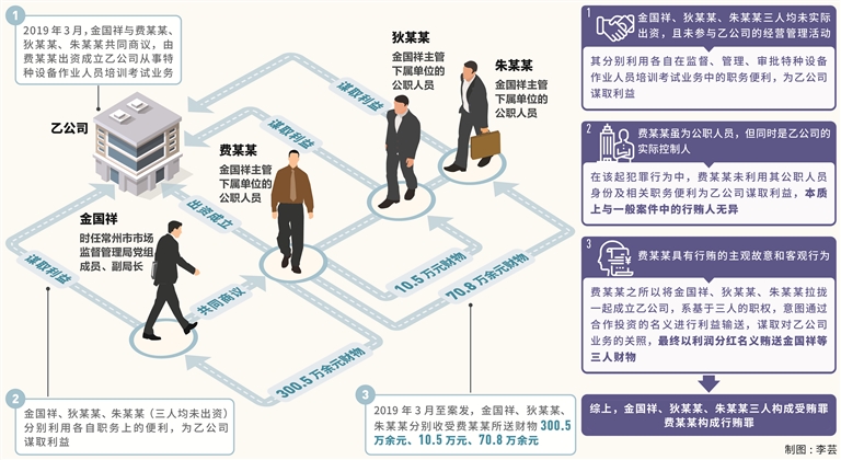 2019年3月,时任常州市市场监督管理局党组成员、副局长的金国祥与其主管下属单位的公职人员费某某、狄某某、朱某某(均另案处理)共同商议,由费某某出资以其子名义成立乙公司从事特种设备作业人员培训考试业务,金国祥、狄某某、朱某某(三人均未出资、未参与乙公司的经营管理)分别利用各自职务上的便利,为乙公司在培训机构认证、考试场次安排等事项上提供帮助。2019年3月至案发,金国祥、狄某某、朱某某分别收受费某某以利润分红名义所送财物300.5万余元、10.5万元、70.8万余元。