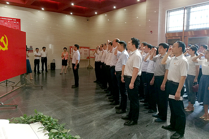 “我志愿加入中国共产党,拥护党的纲领,遵守党的章程,履行党员义务,执行党的决定……”6月29日上午,在冀鲁豫边区抗战史实展馆大厅,市纪委监察委机关60余名党员集体重温入党誓词。