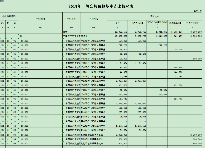 安阳县纪委 201 9 年一般公共预算支出年初预算为 1 503 万元。主要用于以下方面:工资福利支出 895 万元,占 59 % ;对个人家庭补助支出 104 万元,占 0.0 6 % ;商品服务支出 154 万元,占 0. 10 % ;经常性业务费支出 350 万元,占 23 % 。