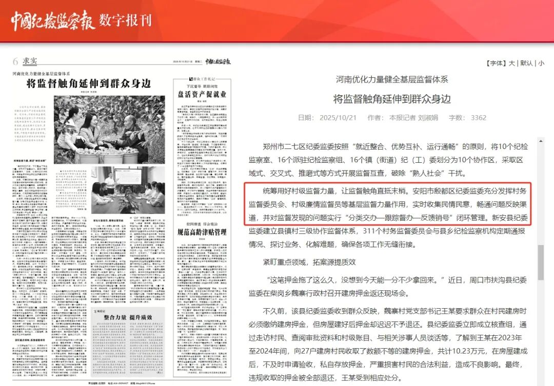统筹用好村级监督力量,让监督触角直抵末梢。安阳市殷都区纪委监委充分发挥村务监督委员会、村级廉情监督员等基层监督力量作用,实时收集民情民意,畅通问题反映渠道,并对监督发现的问题实行“分类交办—跟踪督办—反馈销号”闭环管理。新安县纪委监委建立县镇村三级协作监督体系,311个村务监督委员会与县乡纪检监察机构定期通报情况、探讨业务、化解难题,确保各项工作无缝衔接。