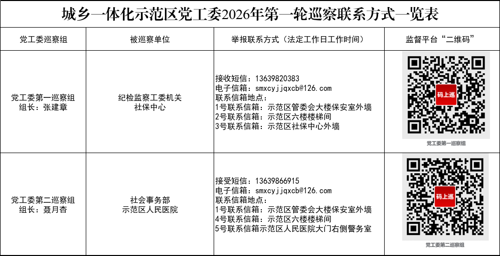 按照城乡一体化示范区党工委统一安排,截至4月15日,2026年第一轮巡察完成进驻。本轮巡察成立2个巡察组,对示范区纪检监察工委机关、社会事务部、社保中心、示范区人民医院4家单位开展巡察。