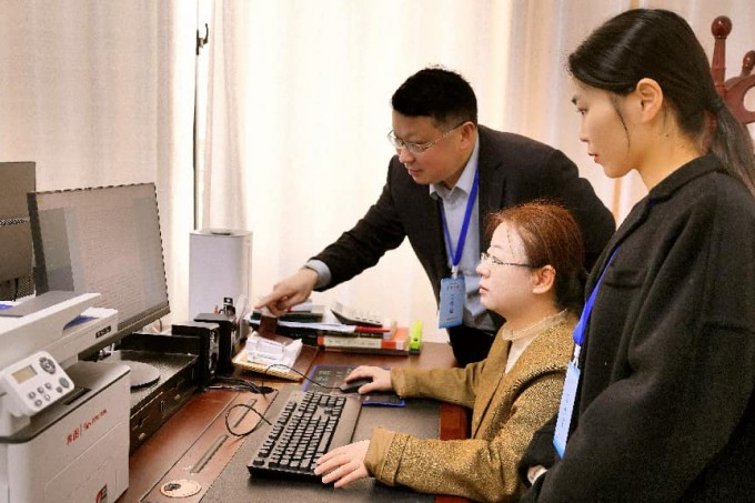 商城县纪委监委坚持减负与赋能并重,着力推动解决涉企检查的“多头”“多次”“重复项”等问题,让企业切实感受到“有事管得住、无事不打扰”的营商环境温度。图为该县纪检监察干部到县优化营商环境中心调阅企业诉求响应平台相关数据。(商城县纪委监委 周黎明 摄)