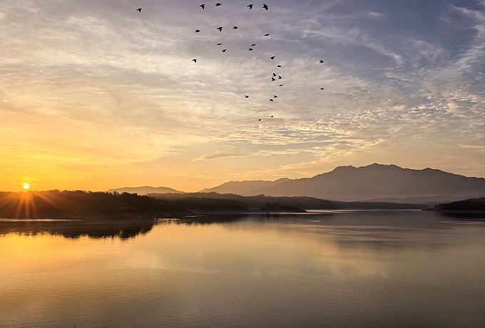 初秋的早晨,朝霞铺撒在静谧的水面上,群鸟凌空飞起,欢快地迎接即将到来的金秋丰收季。(商城县纪委监委 周黎明 摄)