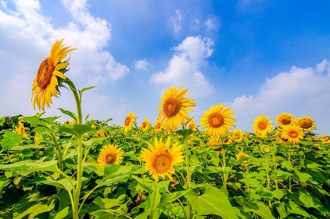 初秋时节,蓝天飘着棉柔云朵,向日葵花田似金色浪涛,金黄花瓣簇拥褐红芯盘,翠绿叶片衬底,朵朵都朝着阳光,将蓬勃生机肆意铺展。(新密市纪委监委供 刘宏恩 摄)