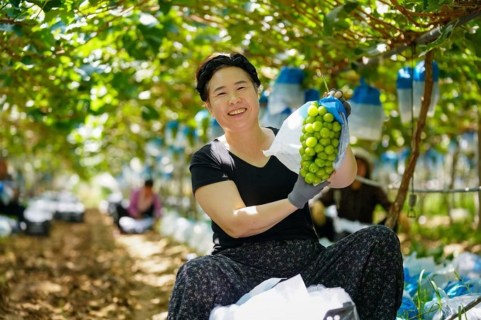 灵宝市沿黄生态廊道葡萄种植基地里,村民正在忙着采摘葡萄,秋日的阳光透过葡萄叶洒下斑驳的光影,绿莹莹的葡萄犹如翡翠珍珠,村民脸上显露出丰收的喜悦。(灵宝市纪委监委供 花雪红 摄)