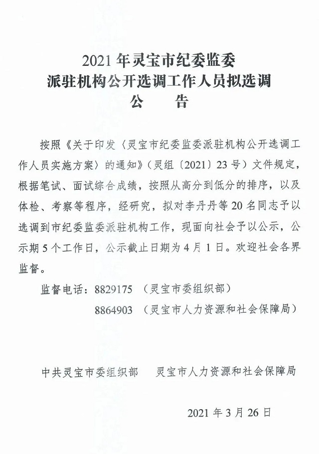 2021年灵宝市纪委监委派驻机构公开选调工作人员拟选调公告