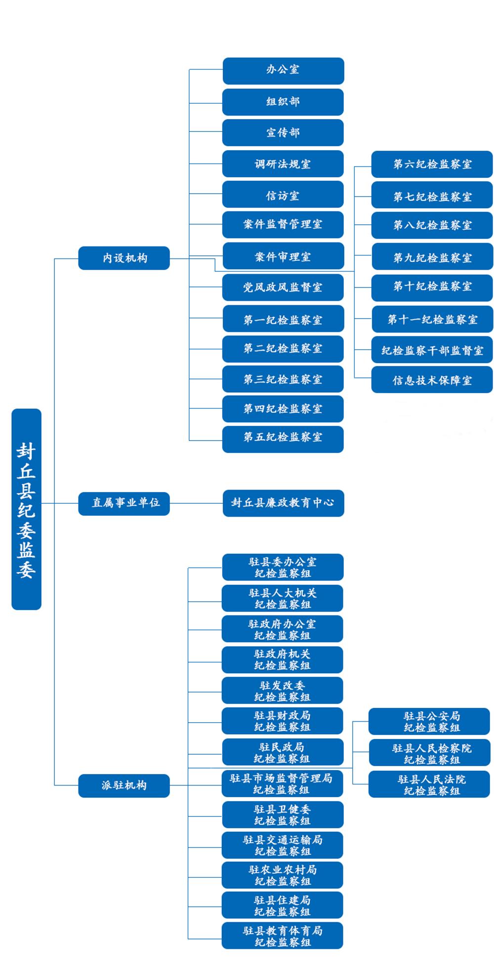 中国共产党封丘县纪律检查委员会机关与封丘县监察委员会合署办公,共有21个内设机构,分别为:办公室、组织部、宣传部、调研法规室、信访室、案件监督管理室、案件审理室、党风政风监督室、第一纪检监察室、第二纪检监察室、第三纪检监察室、第四纪检监察室、第五纪检监察室、第六纪检监察室、第七纪检监察室、第八纪检监察室、第九纪检监察室、第十纪检监察室、第十一纪检监察室、纪检监察干部监督室、信息技术保障室。所属1个事业单位:封丘县廉政教育中心。实现统一管理的派驻机构16个。县委巡察工作领导小组办公室设在县纪委。