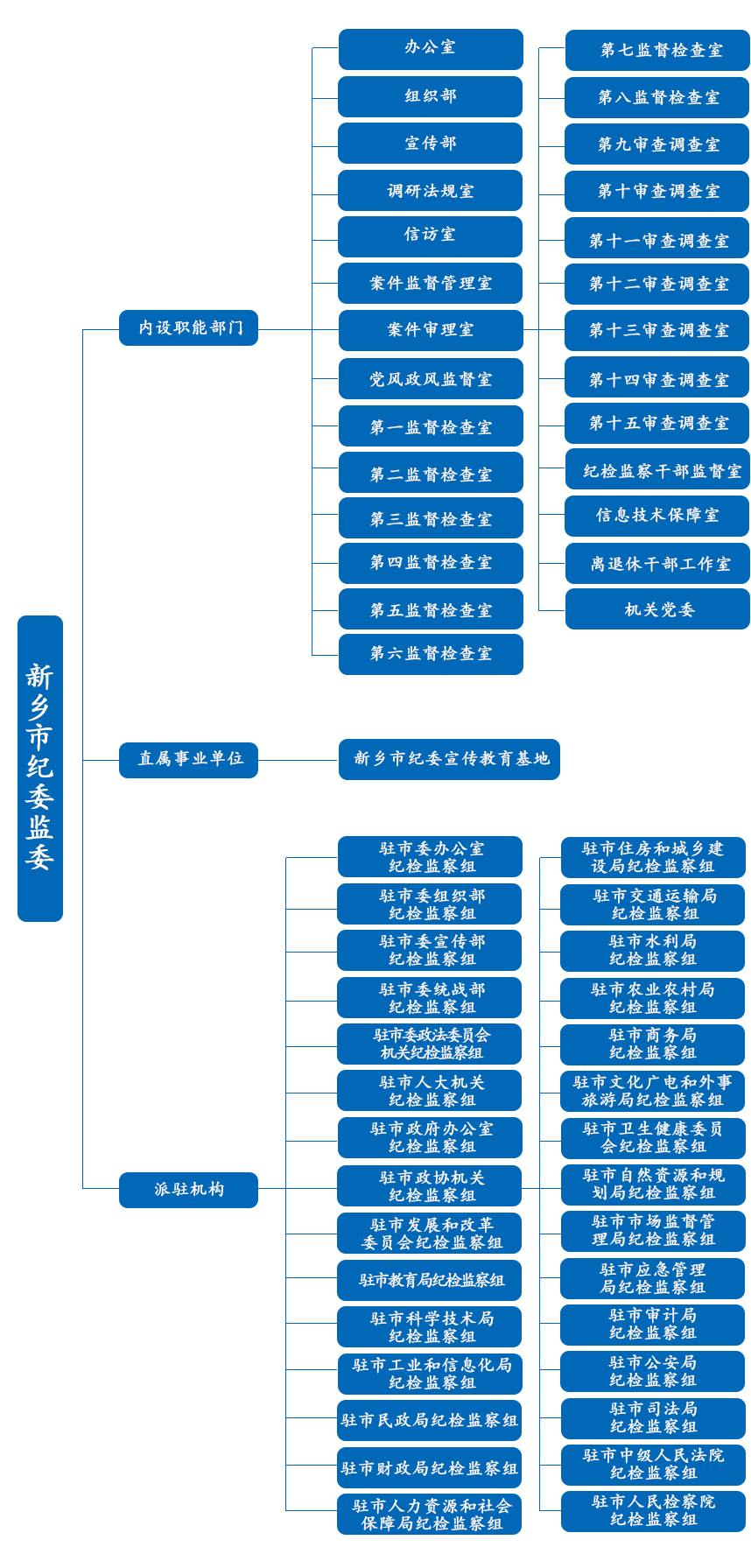 中国共产党新乡市纪律检查委员会机关与新乡市监察委员会合署办公,共有26个内设机构,分别为:办公室、组织部、宣传部、调研法规室、信访室、案件监督管理室、案件审理室、党风政风监督室、第一监督检查室至第八监督检查室、第九审查调查室至第十五审查调查室、纪检监察干部监督室、信息技术保障室、离退休干部工作室,单列机关党委,所属1个事业单位:新乡市纪委宣传教育基地。实行统一管理的派驻机构30个,分别为:驻市委办公室纪检监察组、驻市委组织部纪检监察组、驻市委宣传部纪检监察组、驻市委统战部纪检监察组、驻市委政法委员会机关纪检监察组、驻市人大机关纪检监察组、驻市政府办公室纪检监察组、驻市政协机关纪检监察组、驻市发展和改革委员会纪检监察组、驻市教育局纪检监察组、驻市科学技术局纪检监察组、驻市工业和信息化局纪检监察组、驻市民政局纪检监察组、驻市财政局纪检监察组、驻市人力资源和社会保障局纪检监察组、驻市住房和城乡建设局纪检监察组、驻市交通运输局纪检监察组、驻市水利局纪检监察组、驻市农业农村局纪检监察组、驻市商务局纪检监察组、驻市文化广电和外事旅游局纪检监察组、驻市卫生健康委员会纪检监察组、驻市自然资源和规划局纪检监察组、驻市市场监督管理局纪检监察组、驻市应急管理局纪检监察组、驻市审计局纪检监察组、驻市公安局纪检监察组、驻市司法局纪检监察组、驻市中级人民法院纪检监察组、驻市人民检察院纪检监察组。