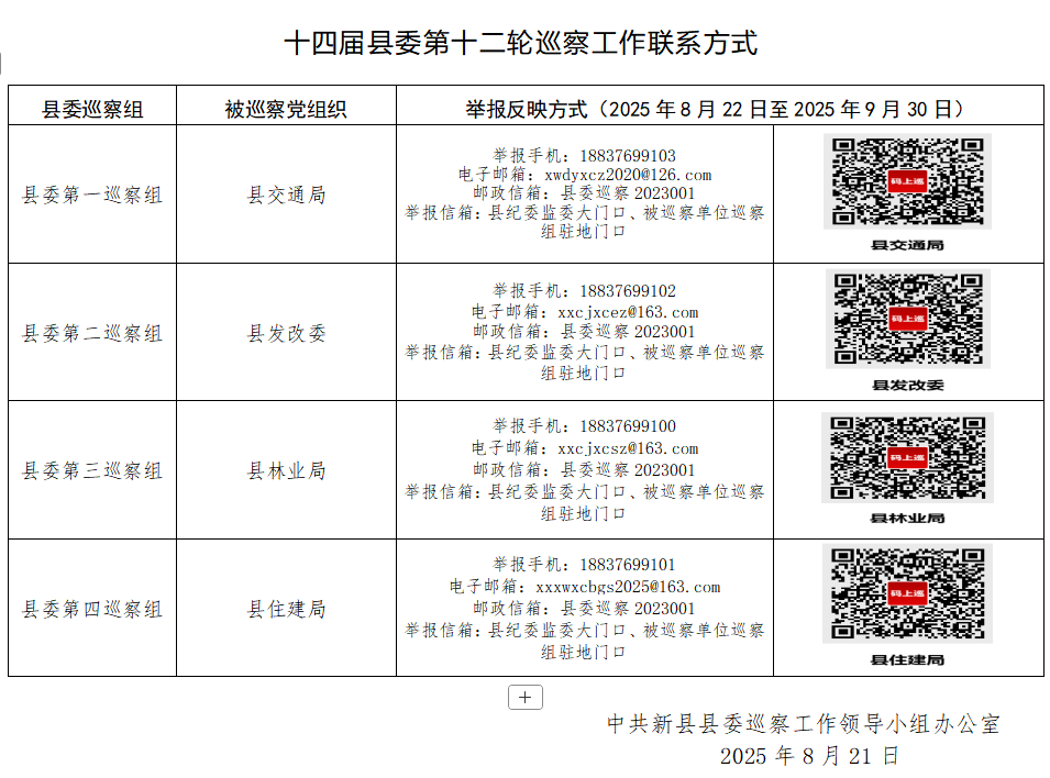 本轮巡察于8月20日启动,9月30日前结束现场巡察,现场巡察时间为35天。巡察期间设举报电话、电子邮箱、邮政信箱、征求意见箱和“码上巡”微信二维码,主要受理反映被巡察单位党组织领导班子成员、其他科级干部,内设机构、下属机构主要负责人及重要岗位人员问题的来信来电来访。
