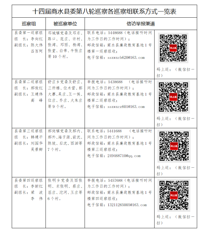 根据县委统一部署,截止4月9日,十四届县委第八轮巡察完成进驻。本轮巡察共派出4个巡察组,采取“乡村一体巡”的方式,分别对邓城镇党委及所辖的邓东等10个村、舒庄乡党委及所辖的舒庄等9个村、郝岗镇党委及所辖的郝内等7个村、张明乡党委及所辖的西张明等6个村开展巡察,时间为40天。
